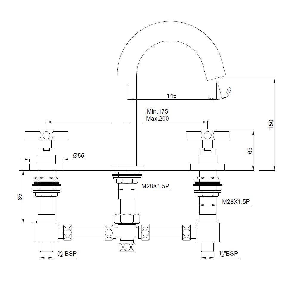 Bath Tub Filler consisting of 2 Control Cocks and One Spout, 20mm Cartridge Size