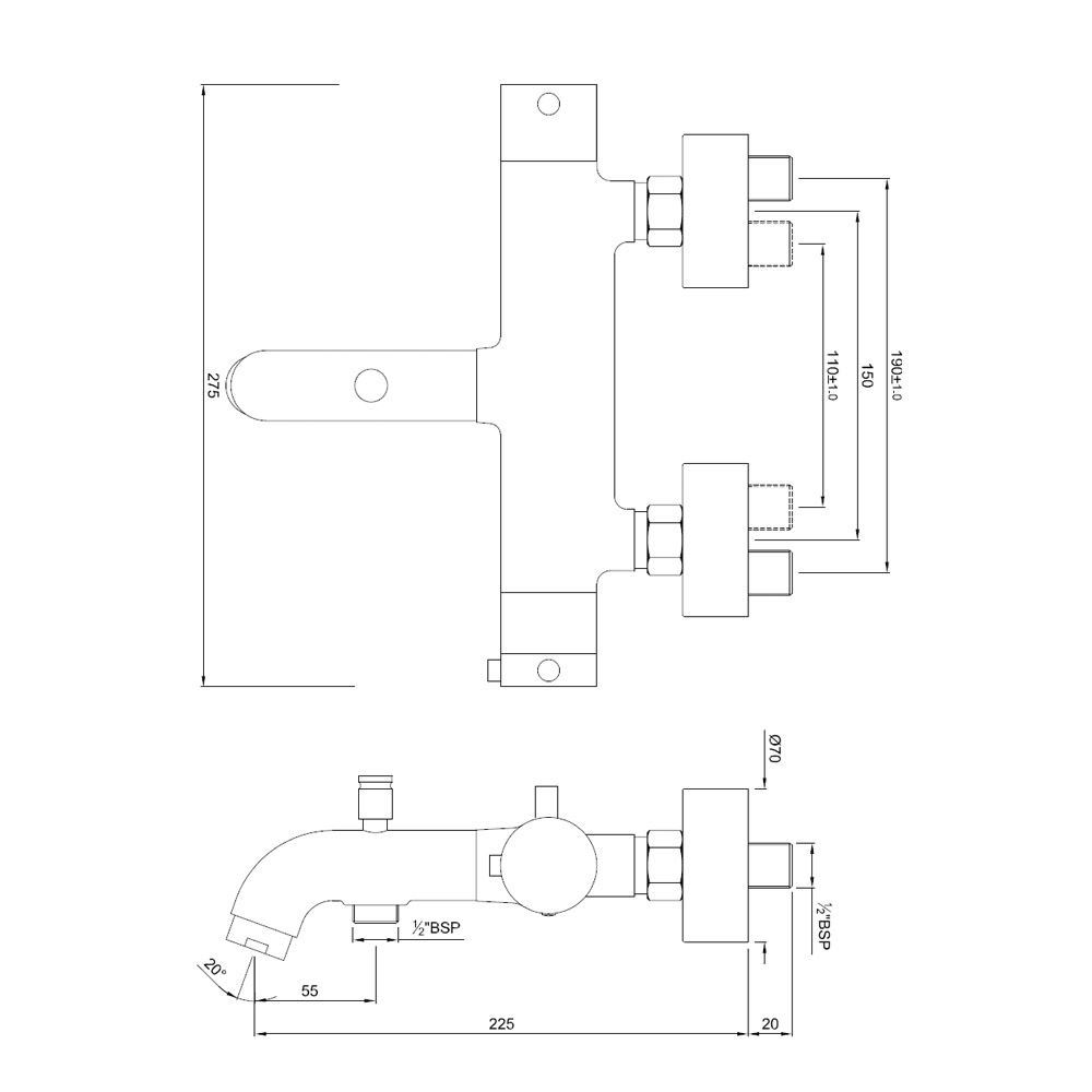 Exposed Bath Shower Mixer (Wall Mounted) with Thermosatic Control Cartidge with Button Attachment on Spout with Connecting Legs & Wall Flanges