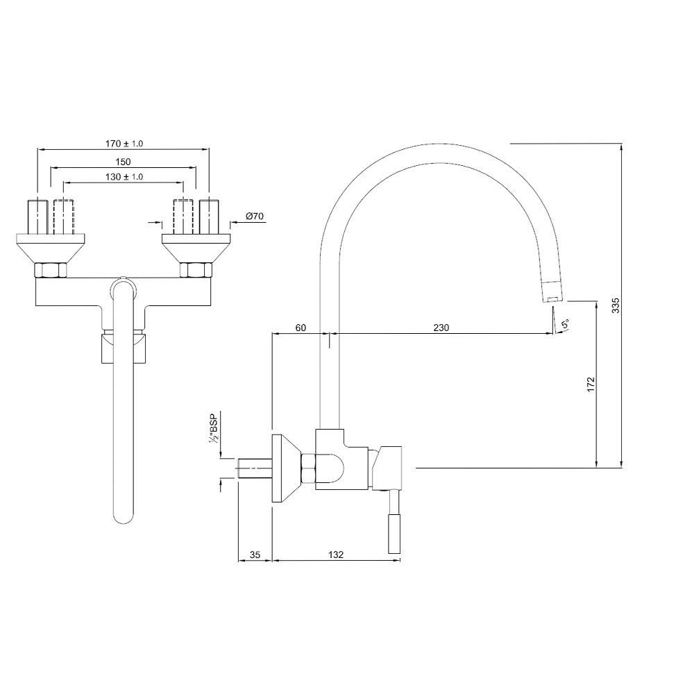 Single Lever Sink Mixer With Swinging Spout on Upper Side (Wall Mounted Model) With Connecting Legs & Wall Flanges
